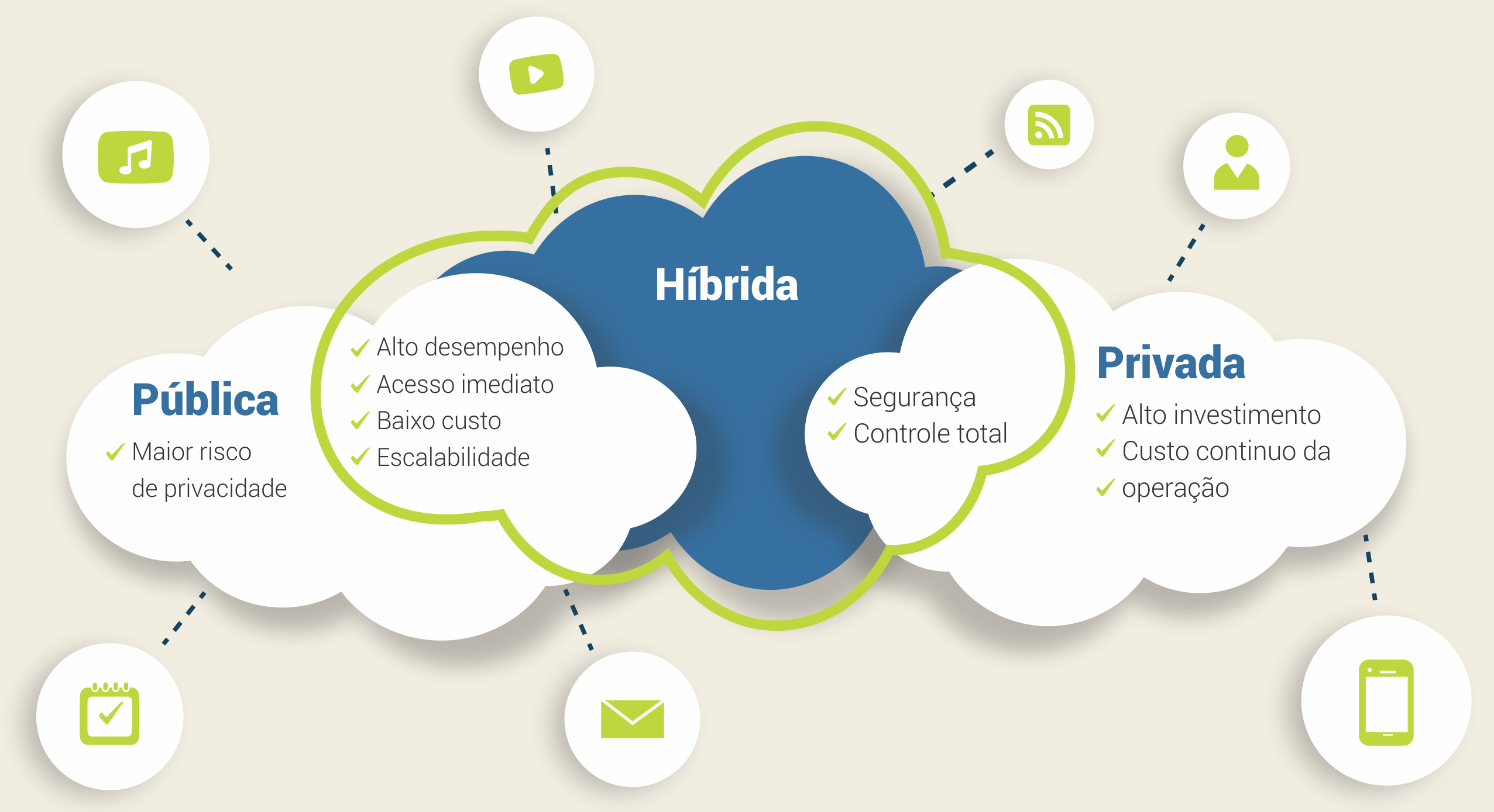 Utilize soluções híbridas para alinhar seus próprios recursos e equipamentos com os disponibilizados em nuvem. Explore a alta tecnologia e disponibilidade dos recursos em nuvem otimizando custos, reduzindo investimentos e mantendo internamente os serviços menos essenciais e que demandam menos desempenho e menor disponibilidade.